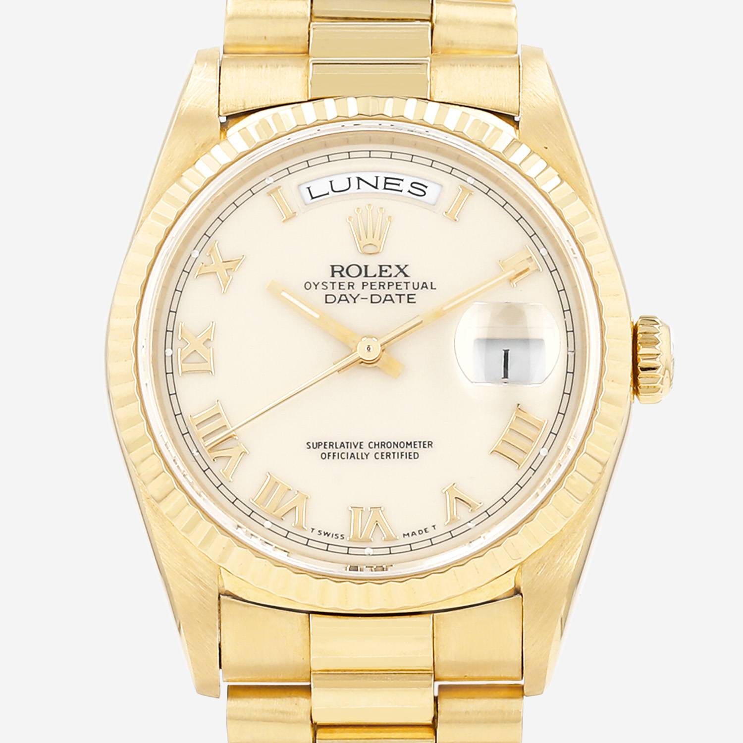 Yellow gold Rolex Day-Date wristwatch. Round case in yellow gold, screwed caseback, yellow gold striated bezel, screw-down crown.