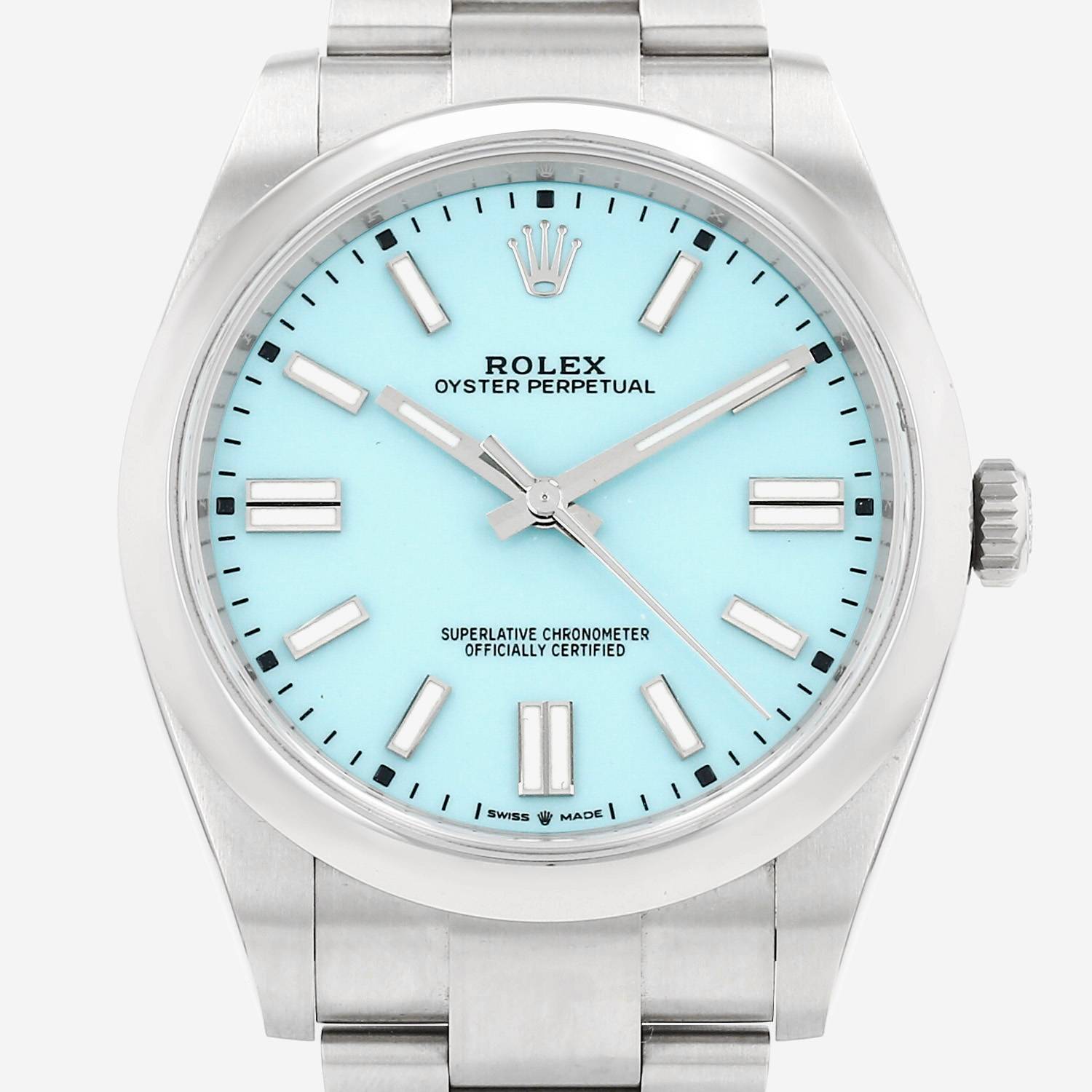Stainless steel Rolex Oyster Perpetual wristwatch. Round case in stainless steel, screwed caseback, stainless steel smooth bezel, screw-down crown.