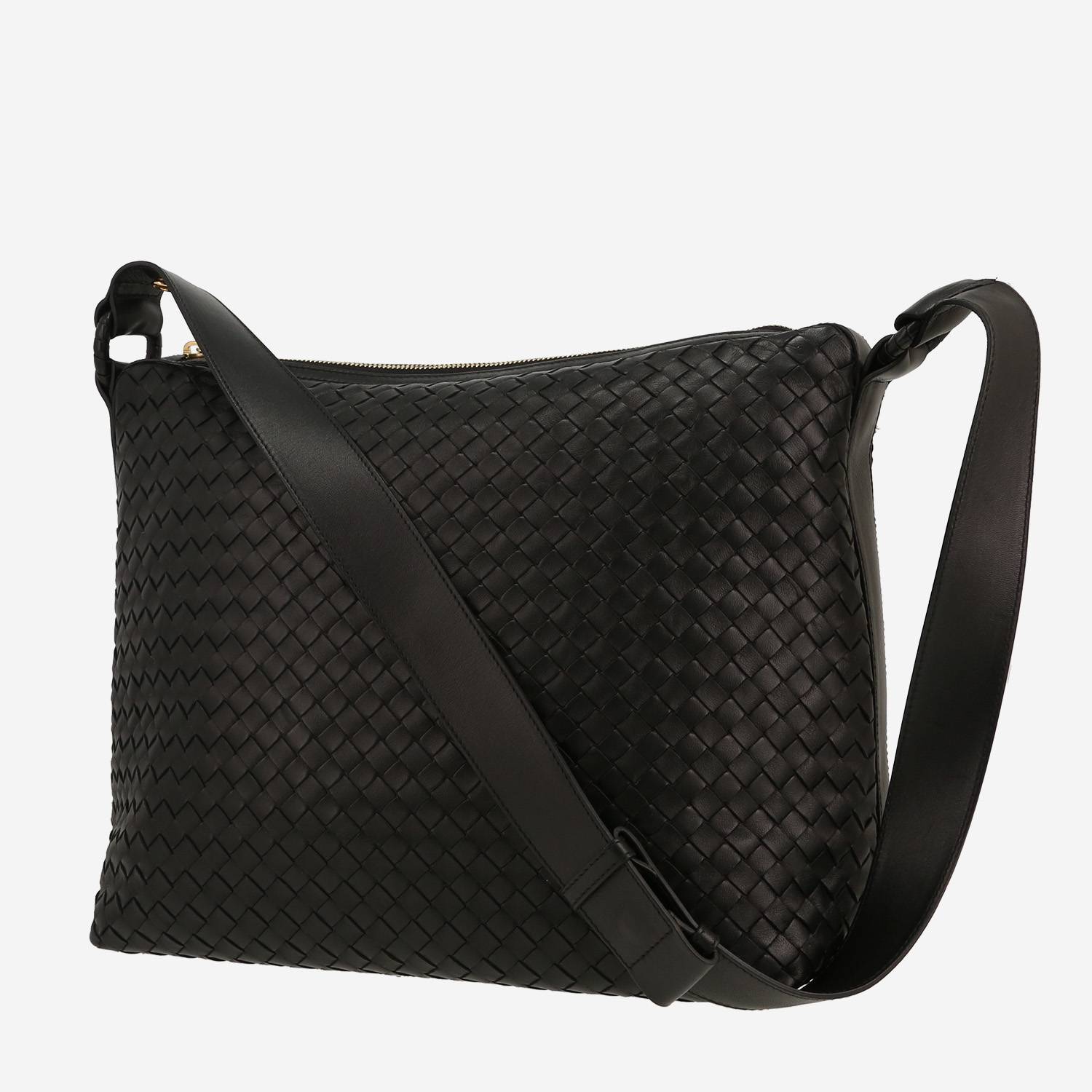 Delicate Bottega Veneta shoulder bag in black intrecciato leather, hardware in gilt metal, one shoulder strap in black leather allowing the bag to be worn on the shoulder or accross the body.