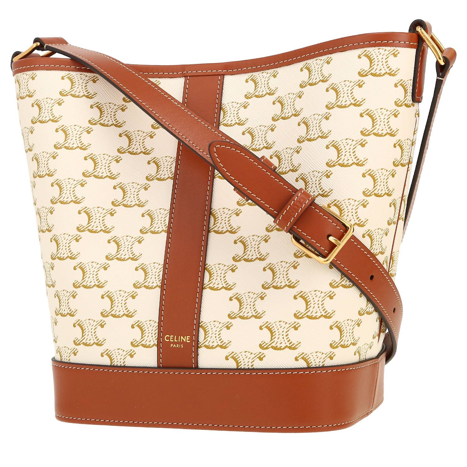 Elegant small model Celine Seau shoulder bag in white "Triomphe" canvas, hardware in gilt metal, one adjustable shoulder strap in brown leather allowing the bag to be worn on the shoulder or accross the body.