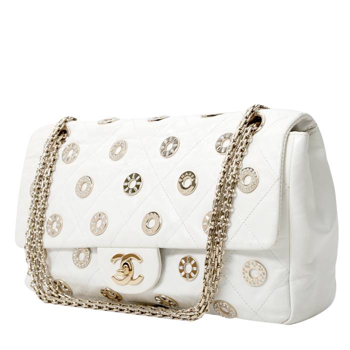 Magnificent Chanel Baguette handbag in white leather, hardware in gilt metal, one convertible chain strap in gilt metal allowing the bag to be worn on the shoulder or accross the body.