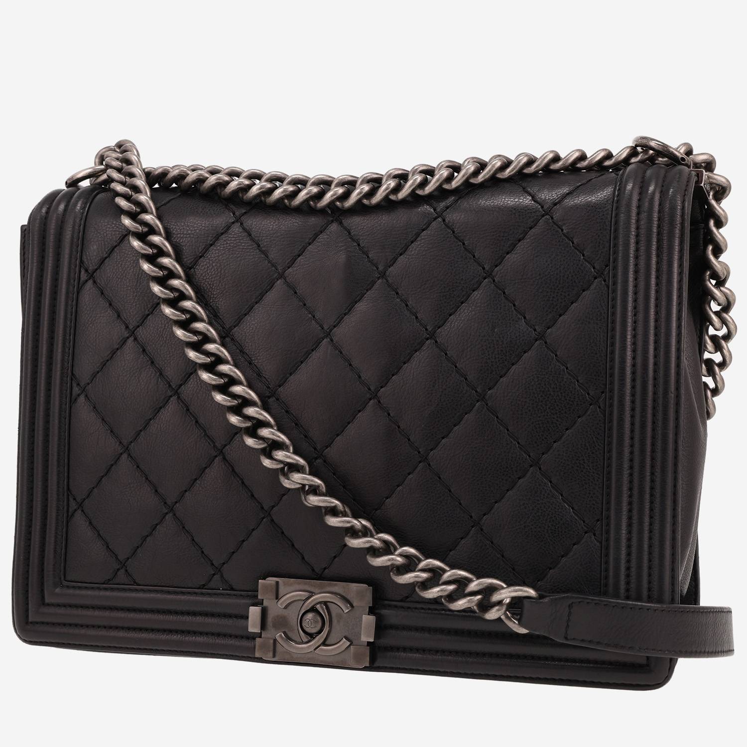 Unavoidable Chanel Boy shoulder bag in black leather, hardware in blackened silver metal, one convertible chain strap in blackened silver metal allowing the bag to be worn on the shoulder or accross the body.