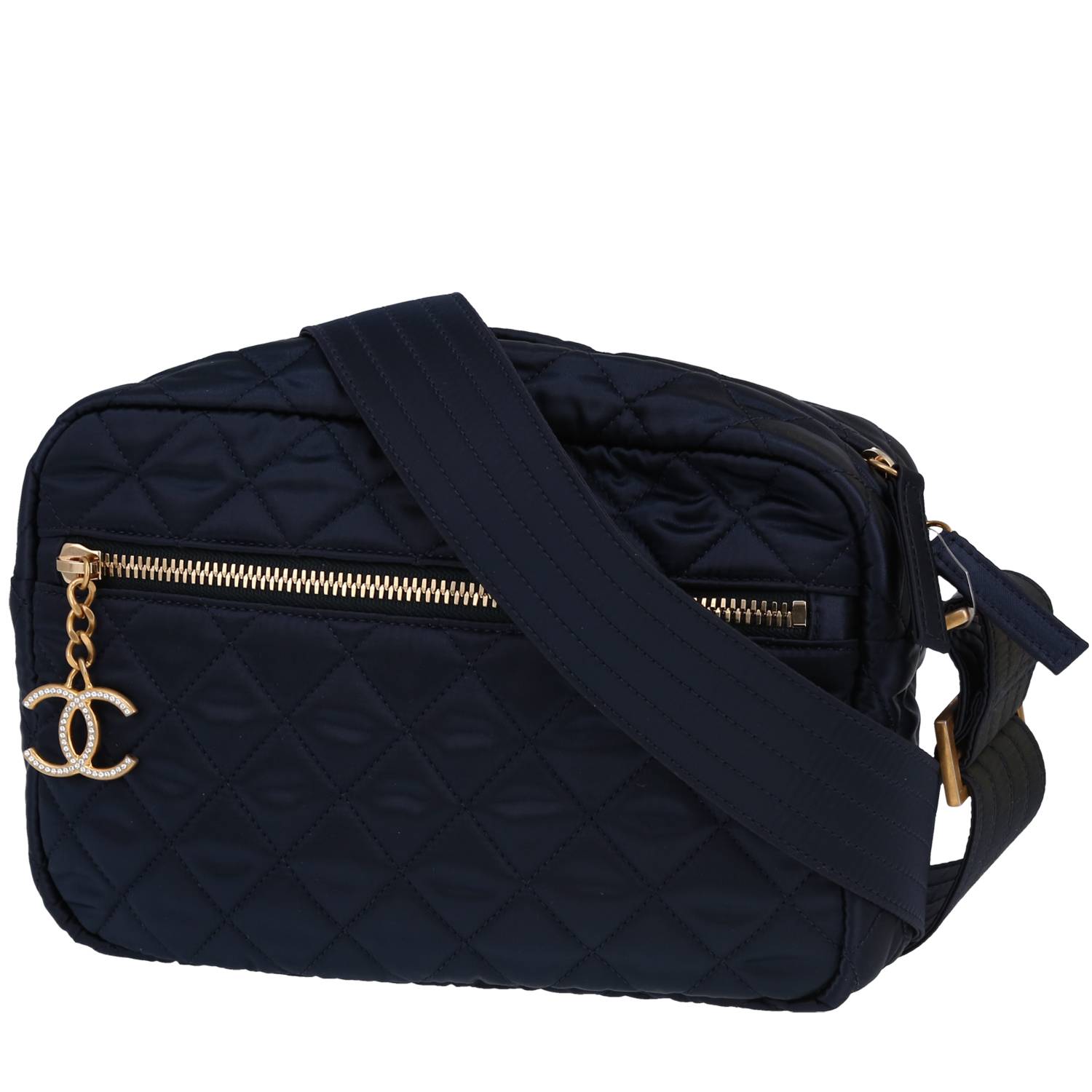 Wonderful Chanel Camera shoulder bag in blue satin, hardware in gilt metal, one adjustable shoulder strap in blue satin allowing the bag to be worn on the shoulder or accross the body.