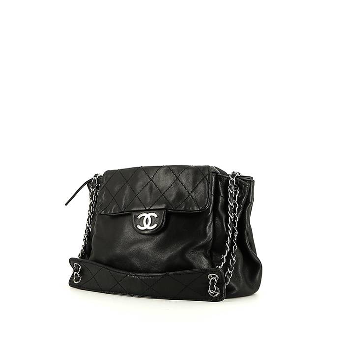 Charming Chanel handbag in black leather, hardware in silver metal, double chain strap in silver metal interwoven with black leather allowing the bag to be worn in the hand or on the shoulder.