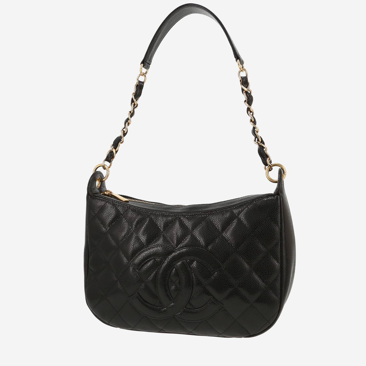 Charming Chanel handbag in black quilted grained leather, hardware in gilt metal, strap in black leather allowing the bag to be worn in the hand or on the shoulder.