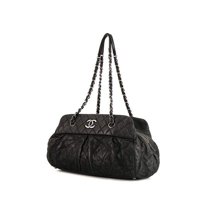 Charming Chanel handbag in black quilted iridescent leather, hardware in blackened silver metal, double chain strap in blackened silver metal interwoven with black leather allowing the bag to be worn in the hand or on the shoulder.