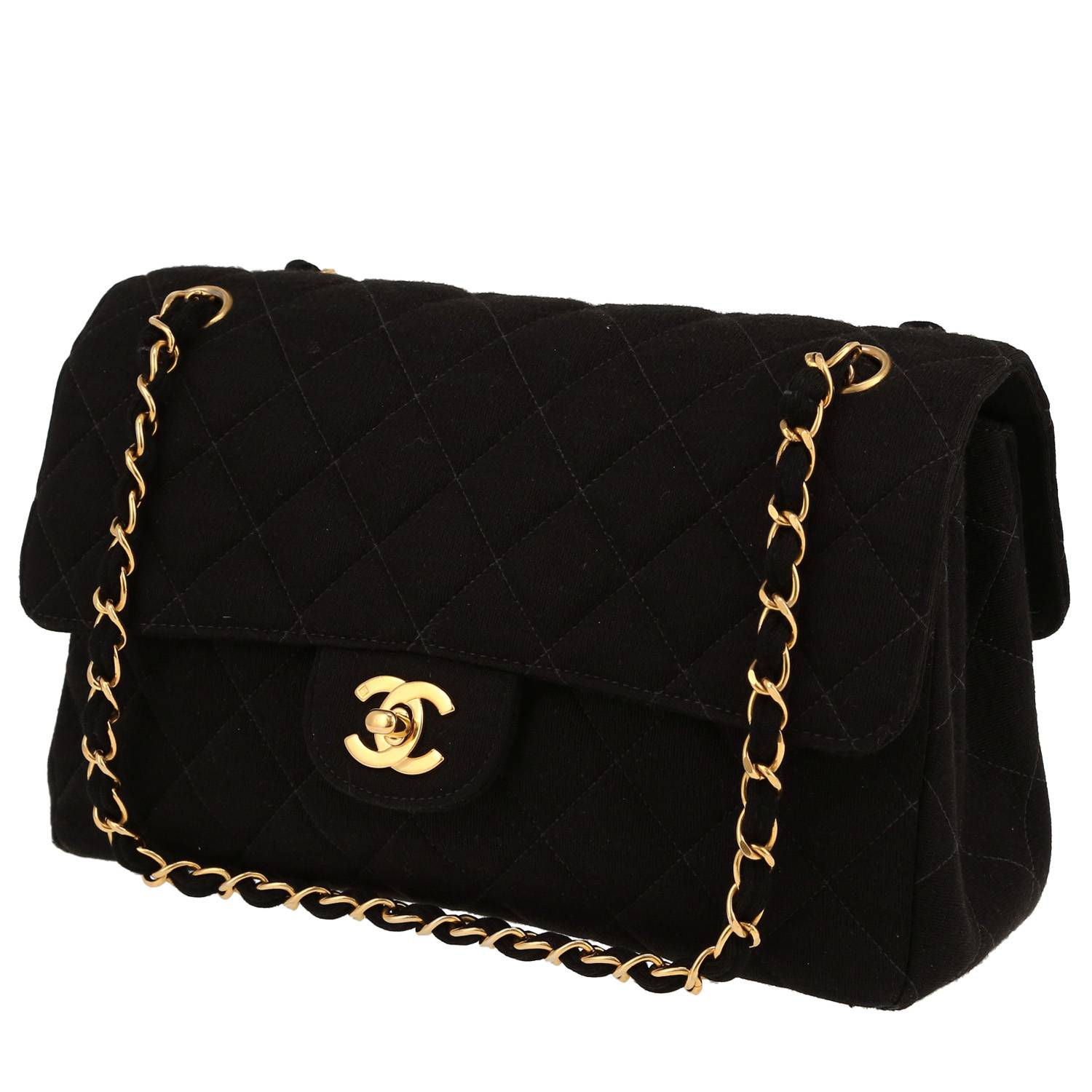Lovely Chanel Timeless Classic handbag in black quilted jersey, hardware in gilt metal, one chain strap in gilt metal interwoven with black jersey allowing the bag to be worn on the hand or across the body.
