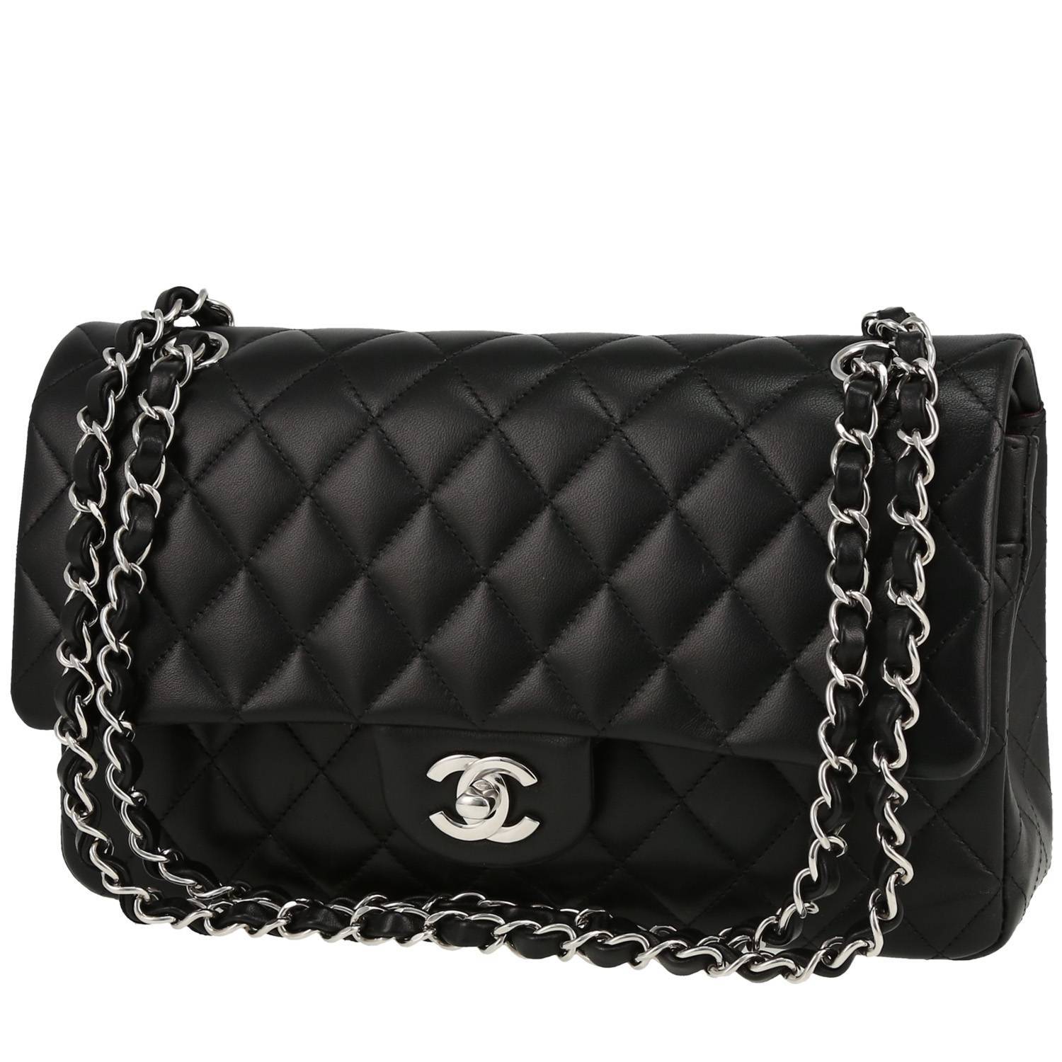 Unavoidable Chanel Timeless Classic handbag in black quilted leather, hardware in silver metal, chain strap in silver metal interwoven with black leather allowing the bag to be worn in the hand or on the shoulder.