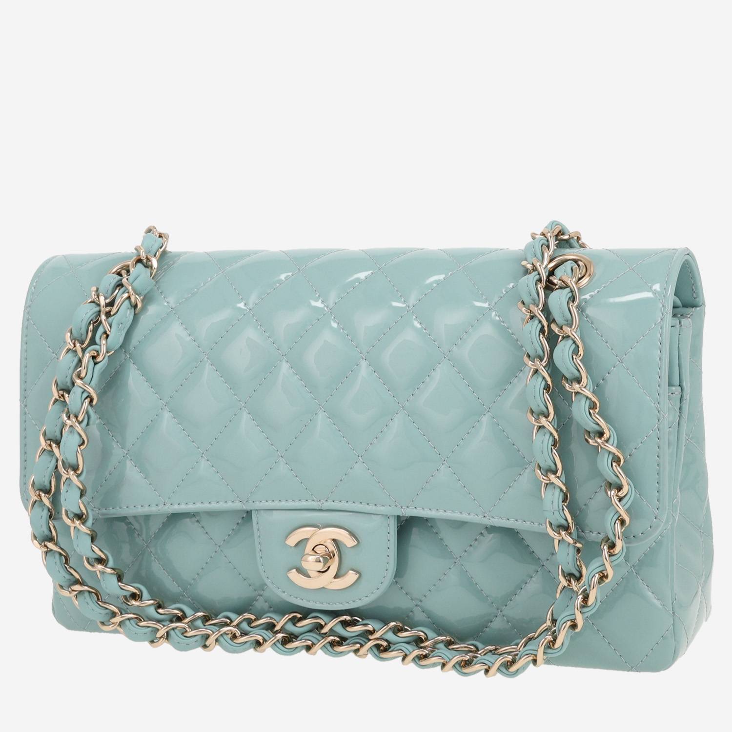 Wonderful Chanel Timeless Classic handbag in blue-green patent quilted leather, hardware in gilt metal, one convertible chain strap in gilt metal interwoven with blue leather allowing the bag to be worn in the hand or on the shoulder.