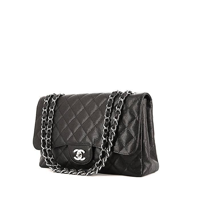 Unavoidable Chanel Timeless handbag in black quilted grained leather, hardware in silver metal, convertible strap in silver metal interwoven with black leather allowing the bag to be worn in the hand or on the shoulder.