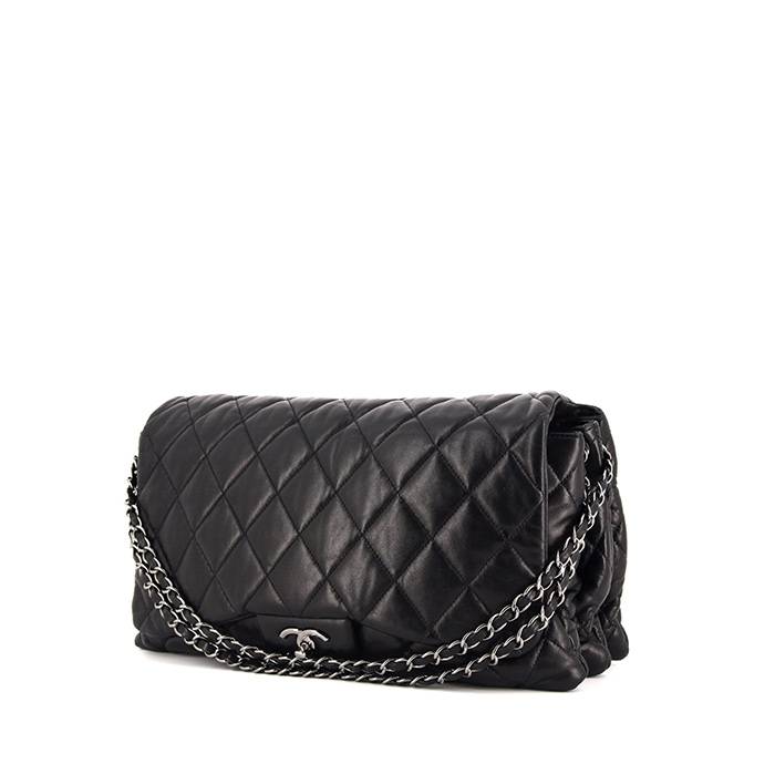 Timeless Chanel Timeless handbag in black quilted leather, hardware in silver metal, black stitchings, strap in silver metal interwoven with black leather allowing the bag to be worn in the hand or on the shoulder.