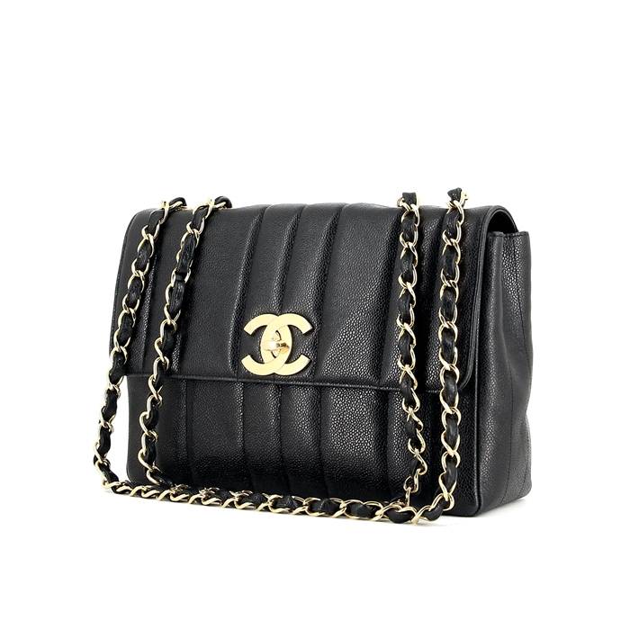Very beautiful "Timeless Jumbo" handbag in black quilted grained leather, chain handle in gilt metal interwoven with black leather.