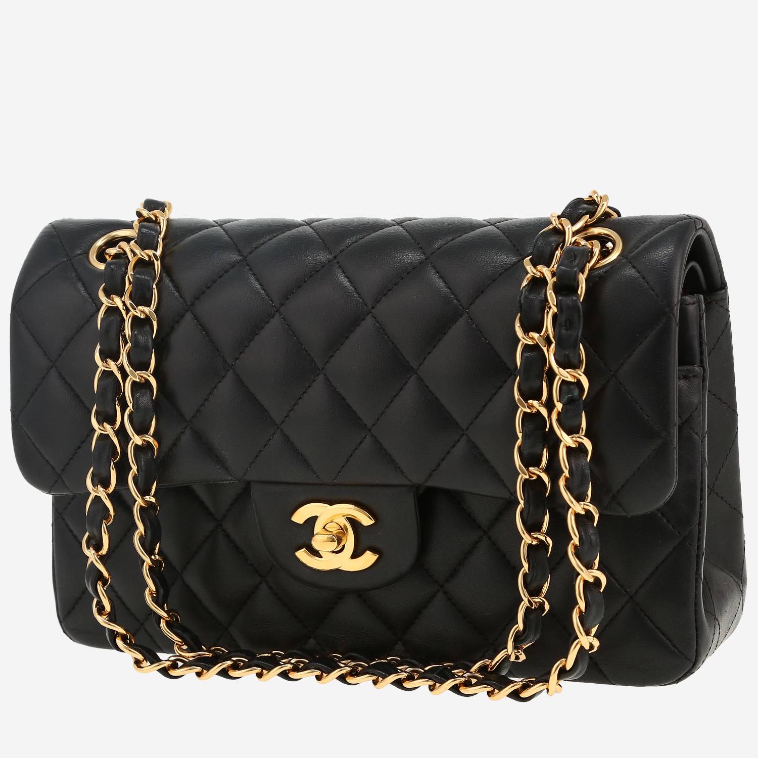 Lovely Chanel Timeless Petit handbag in black quilted leather, hardware in gilt metal, one convertible chain strap in gilt metal interwoven with black leather allowing the bag to be worn in the hand or on the shoulder.