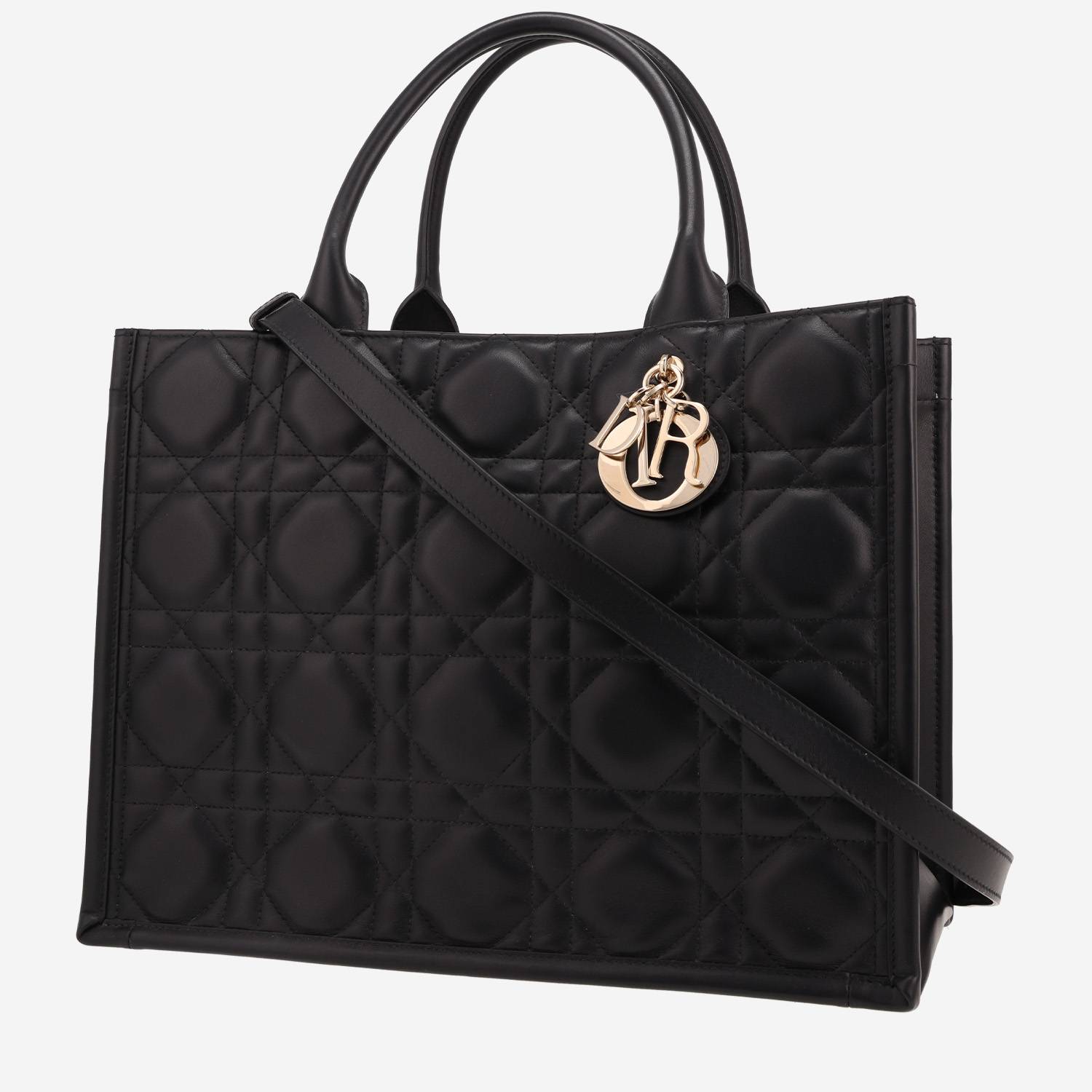 Practical medium model Dior Book Tote shopping bag in black leather cannage, hardware in gilt metal, double handle in black leather, one removable strap in black leather allowing the bag to be worn in the hand or on the shoulder.