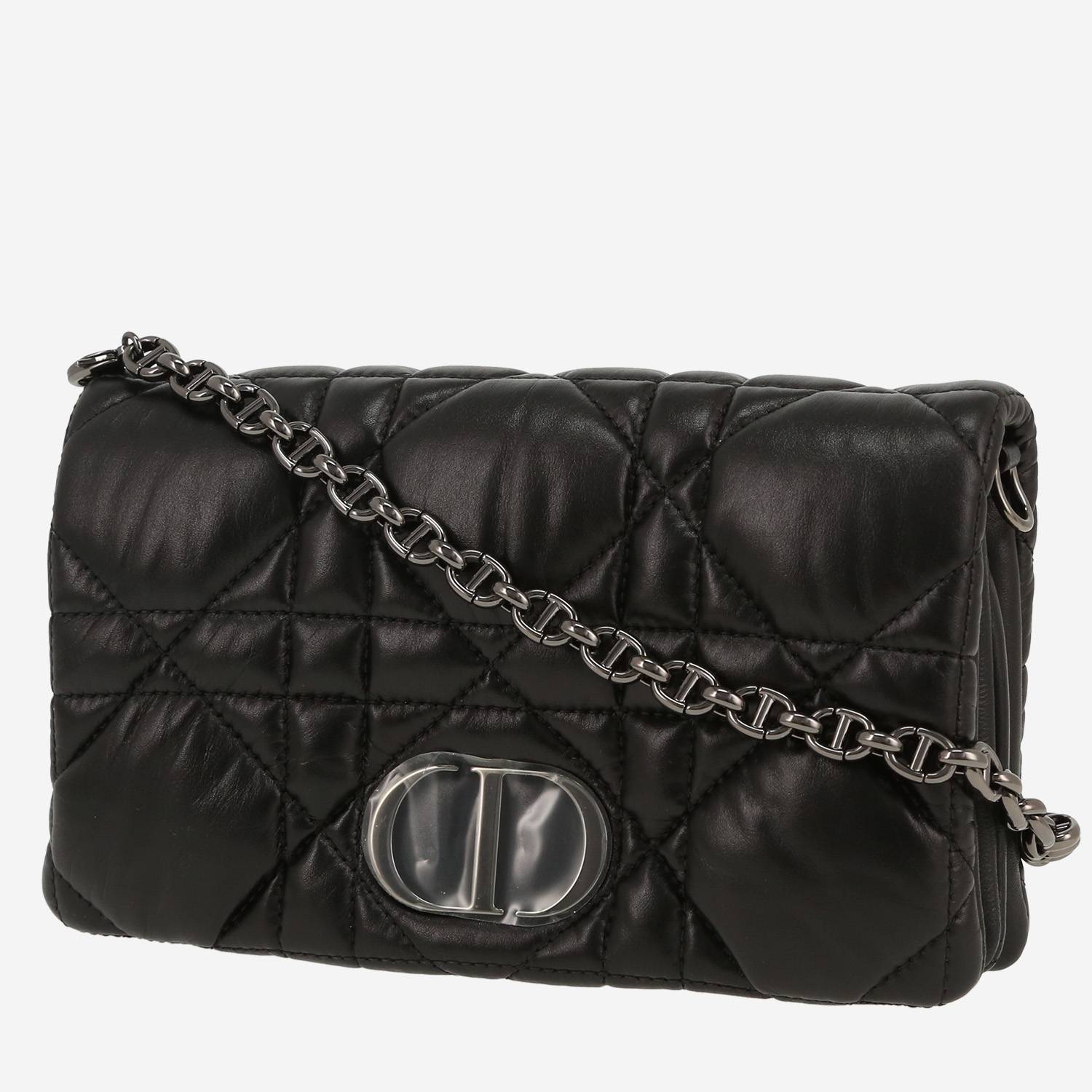 Charming mini Dior Caro shoulder bag in black leather cannage, hardware in blackened metal, one removable chain strap in blackened metal allowing the bag to be worn in the hand or on the shoulder or accross the body.