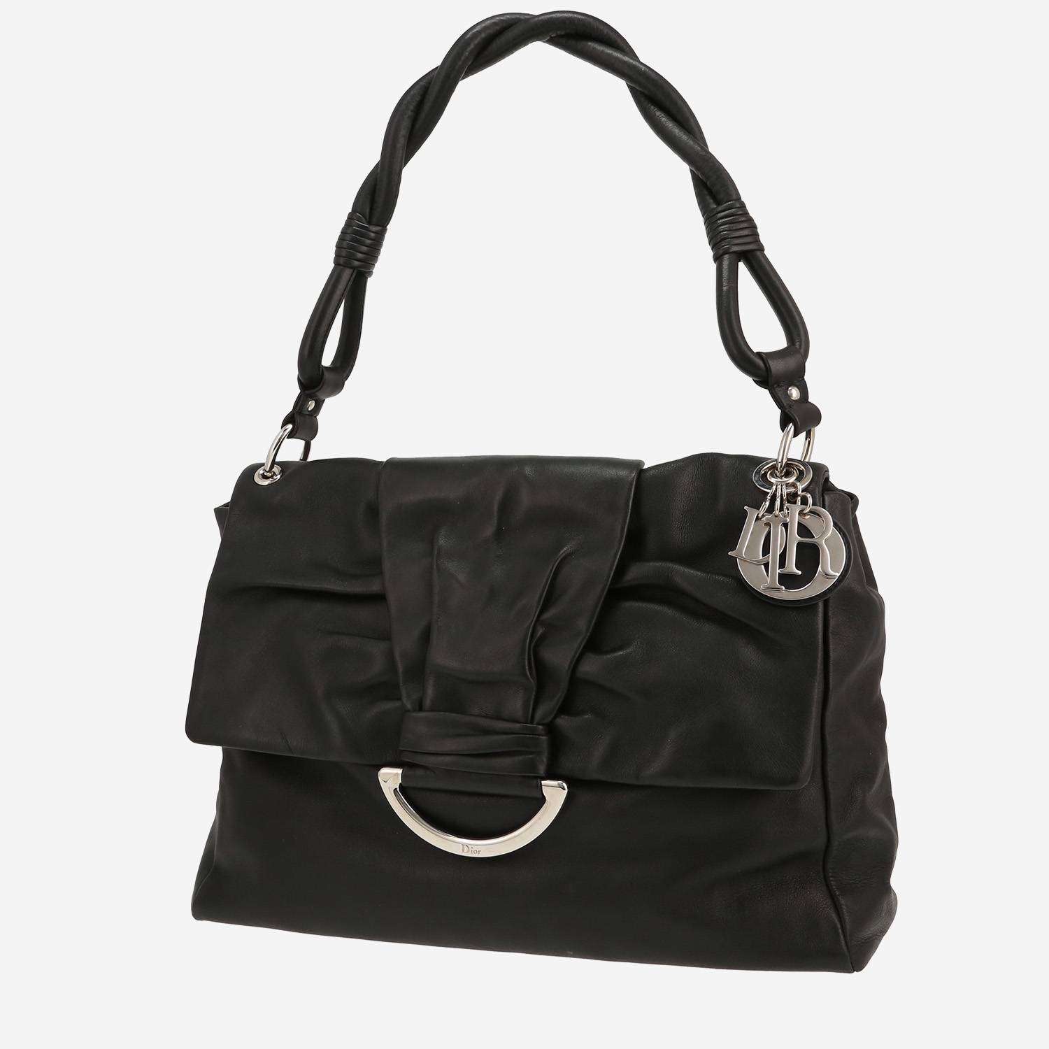 Practical Dior handbag in black leather, hardware in silver metal, one strap in black braided leather allowing the bag to be worn in the hand or on the shoulder.