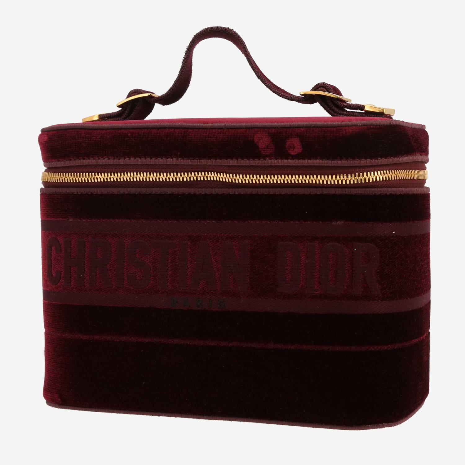 Lovely Dior vanity case in burgundy velvet, hardware in gilt metal, simple handle in burgundy velvet allowing the bag to be worn in the hand.