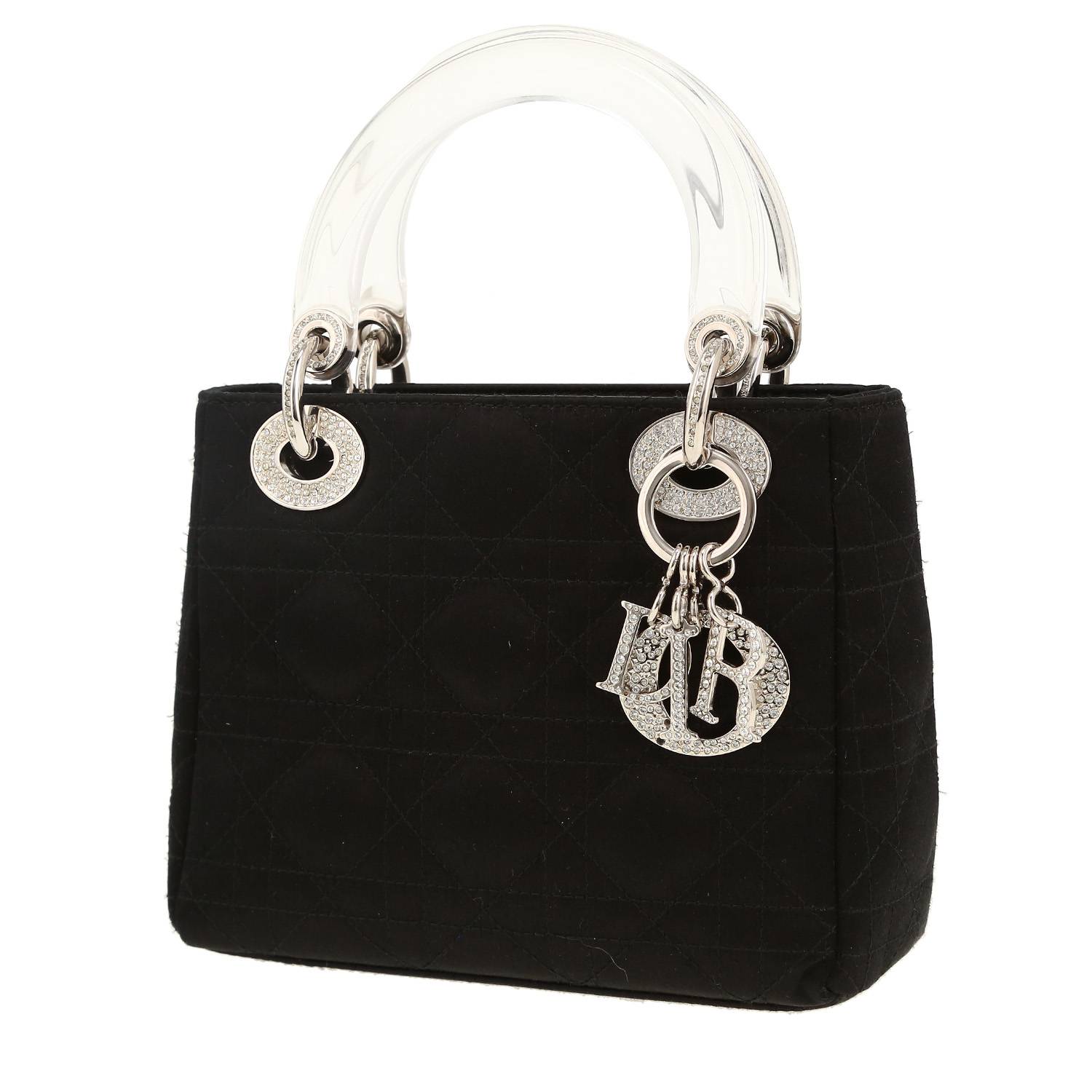 Magnificent Dior Lady Dior handbag in black satin, hardware in silver metal, double handle plexiglas allowing the bag to be worn in the hand.