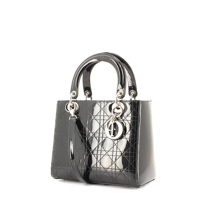 Charming medium model "Lady Dior" handbag in black patent leather with geometric print patterns, hardware in silver metal, double handle in black patent leather, one shoulder strap in black patent leather allowing the bag to be worn in the hand or on the shoulder or accross the body.