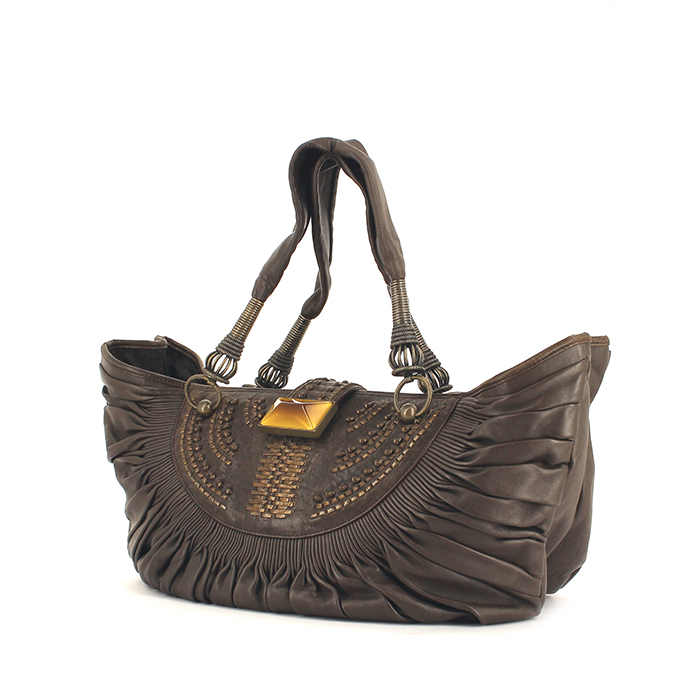 Superb "Plissé" handbag in brown leather, brown leather gilt metal double handle allowing to be worn in the hand or on the shoulder.