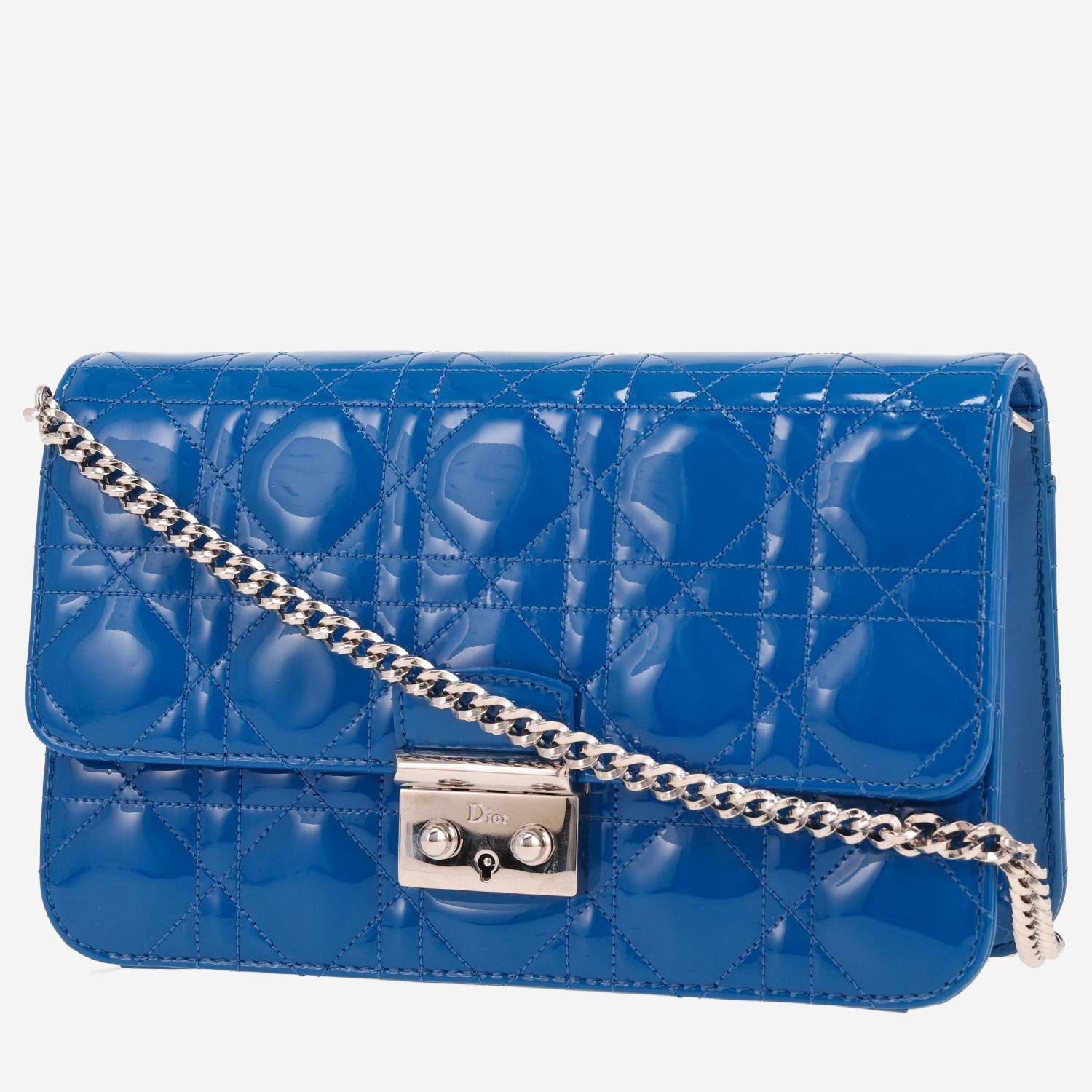 Wonderful Dior Promenade shoulder bag in blue patent leather, hardware in silver metal, one chain strap in silver metal allowing the bag to be worn in the hand or on the shoulder or accross the body.