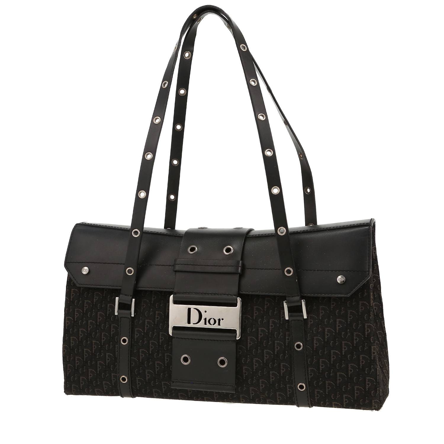 Funny Dior Street Chic handbag in black monogram canvas Oblique, hardware in silver metal, one strap in black leather with hole theme allowing the bag to be worn in the hand or on the shoulder.