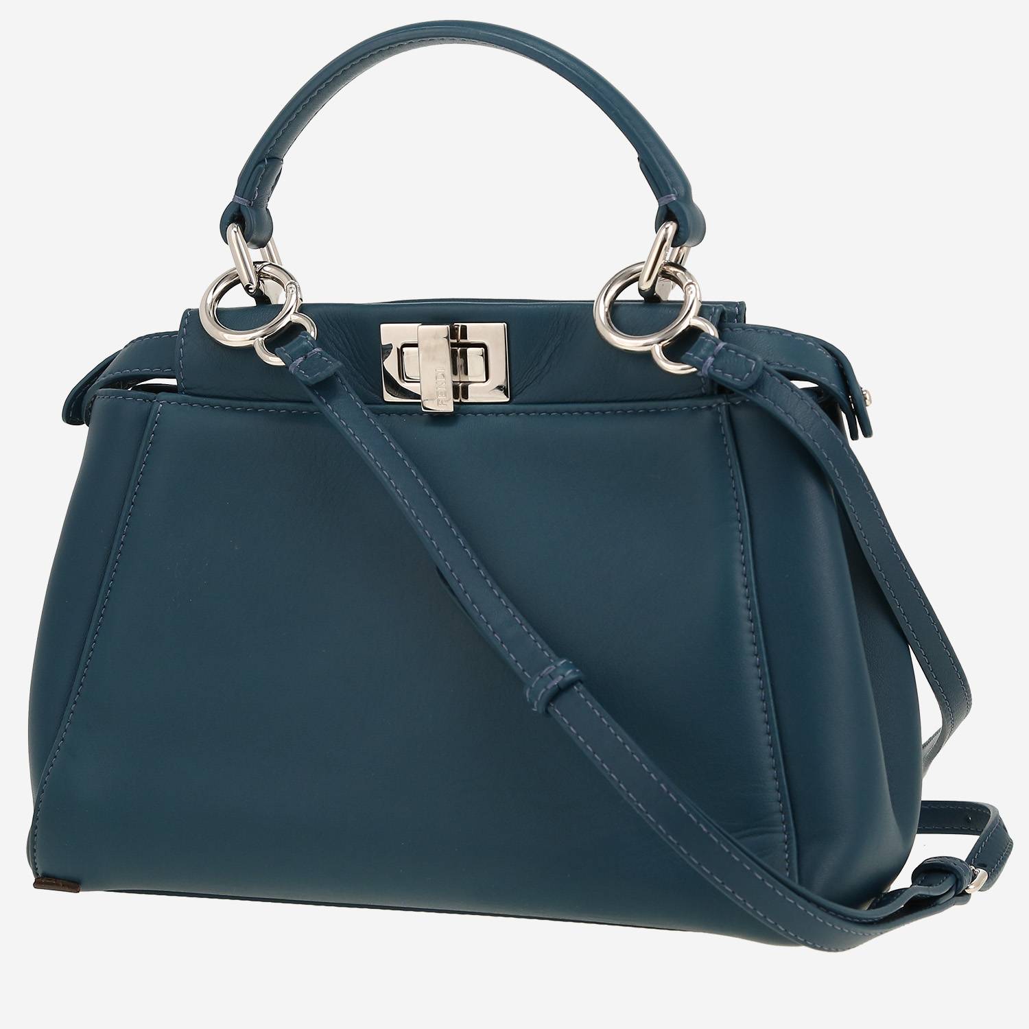 Elegant Fendi Mini Peekaboo shoulder bag in blue leather, hardware in silver metal, simple handle in blue leather, one removable shoulder strap in blue leather allowing the bag to be worn in the hand or on the shoulder or accross the body.