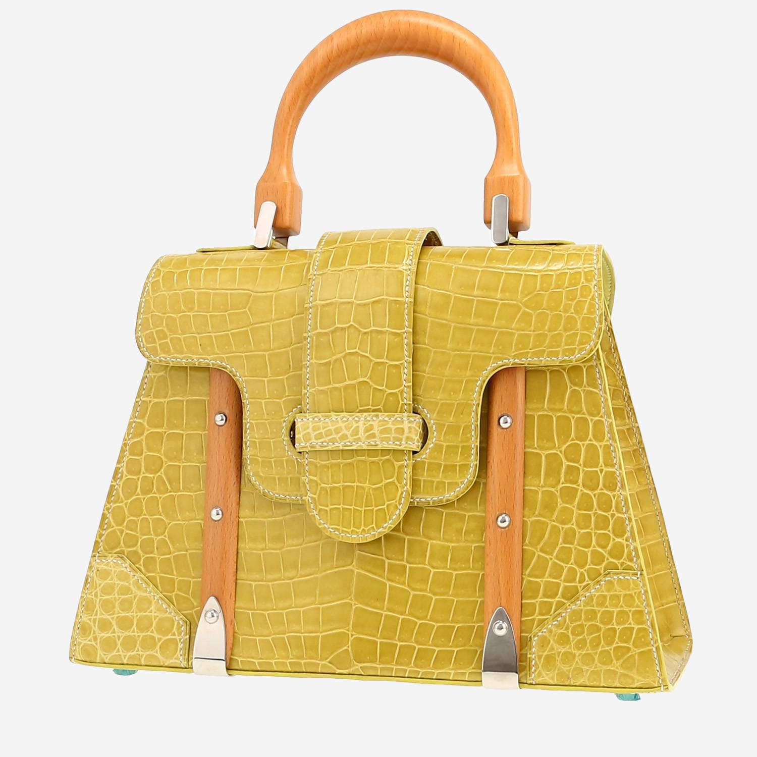 Exceptional Goyard Saigon handbag in green crocodile, hardware in silver metal, simple handle wood allowing the bag to be worn in the hand.