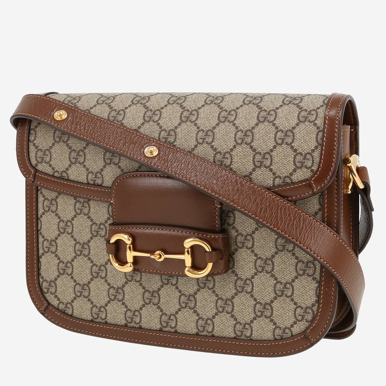 Wonderful Gucci 1955 Horsebit shoulder bag in beige "sûpreme GG" canvas, hardware in gilt metal, one adjustable shoulder strap in brown leather allowing the bag to be worn on the shoulder or accross the body.