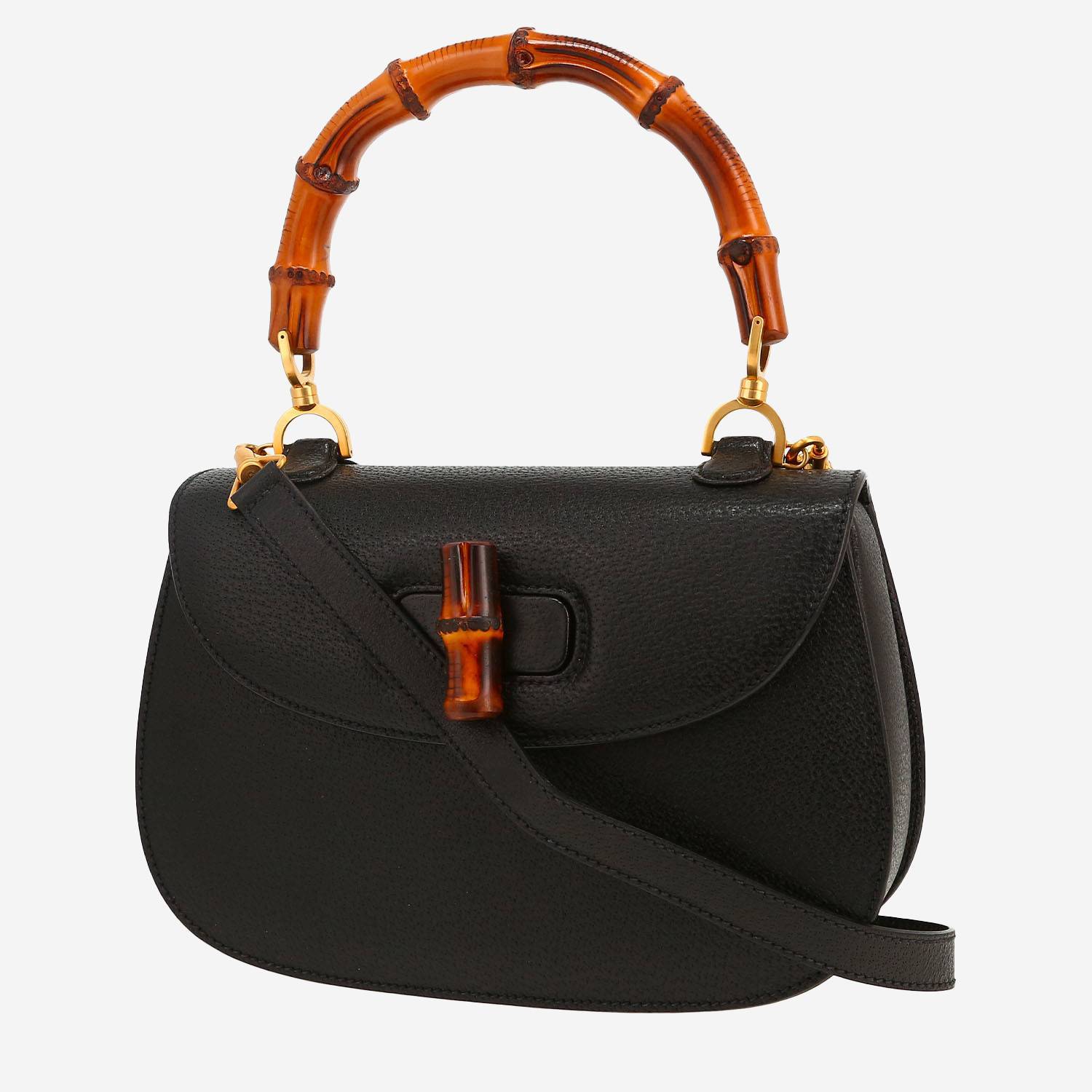 Wonderful medium model Gucci Bamboo handbag in black grained leather, hardware in gilt metal, double handle bamboo, one adjustable and removable strap in black leather allowing the bag to be worn in the hand or on the shoulder or accross the body.