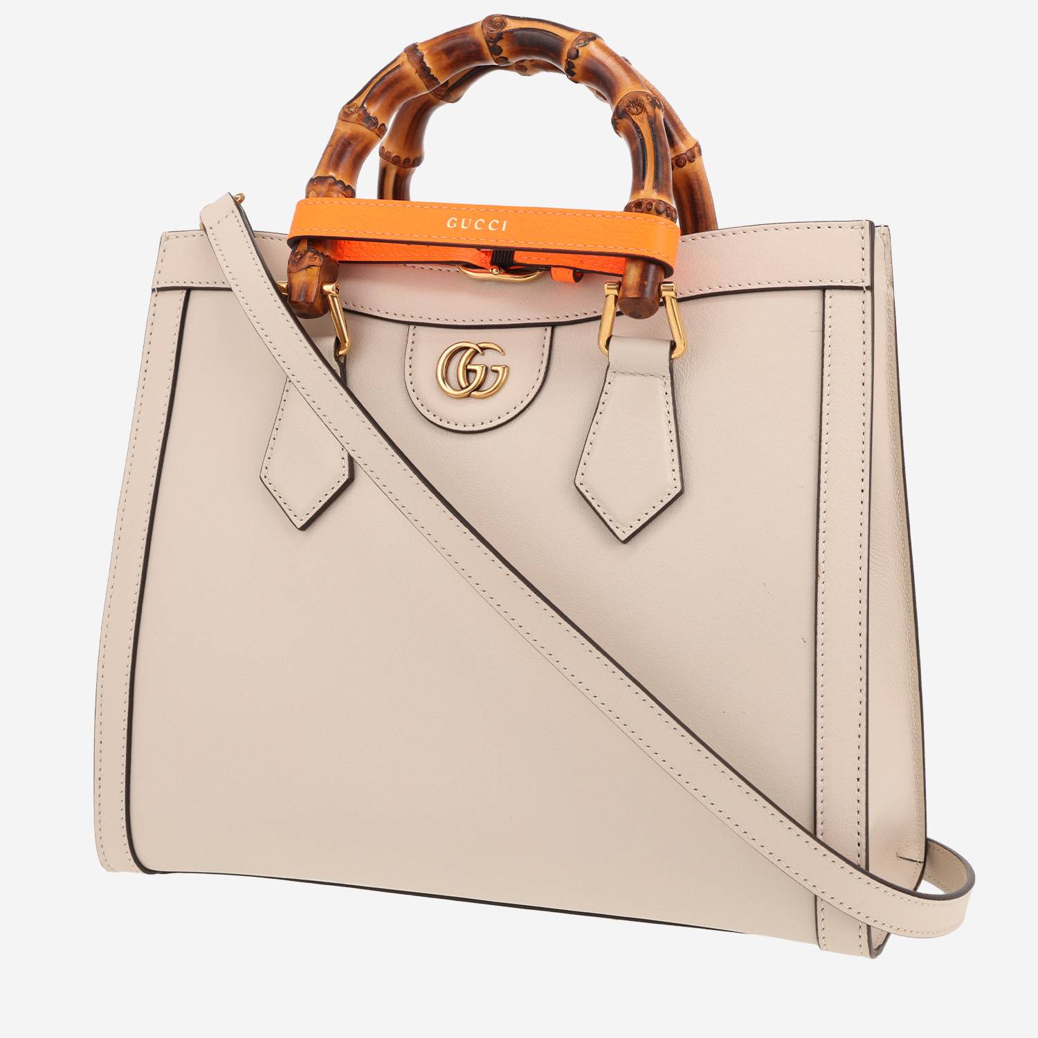 Elegant Gucci Diana handbag in white leather, hardware in gilt metal, double handle bamboo, shoulder strap in white leather allowing the bag to be worn in the hand or on the shoulder or accross the body.