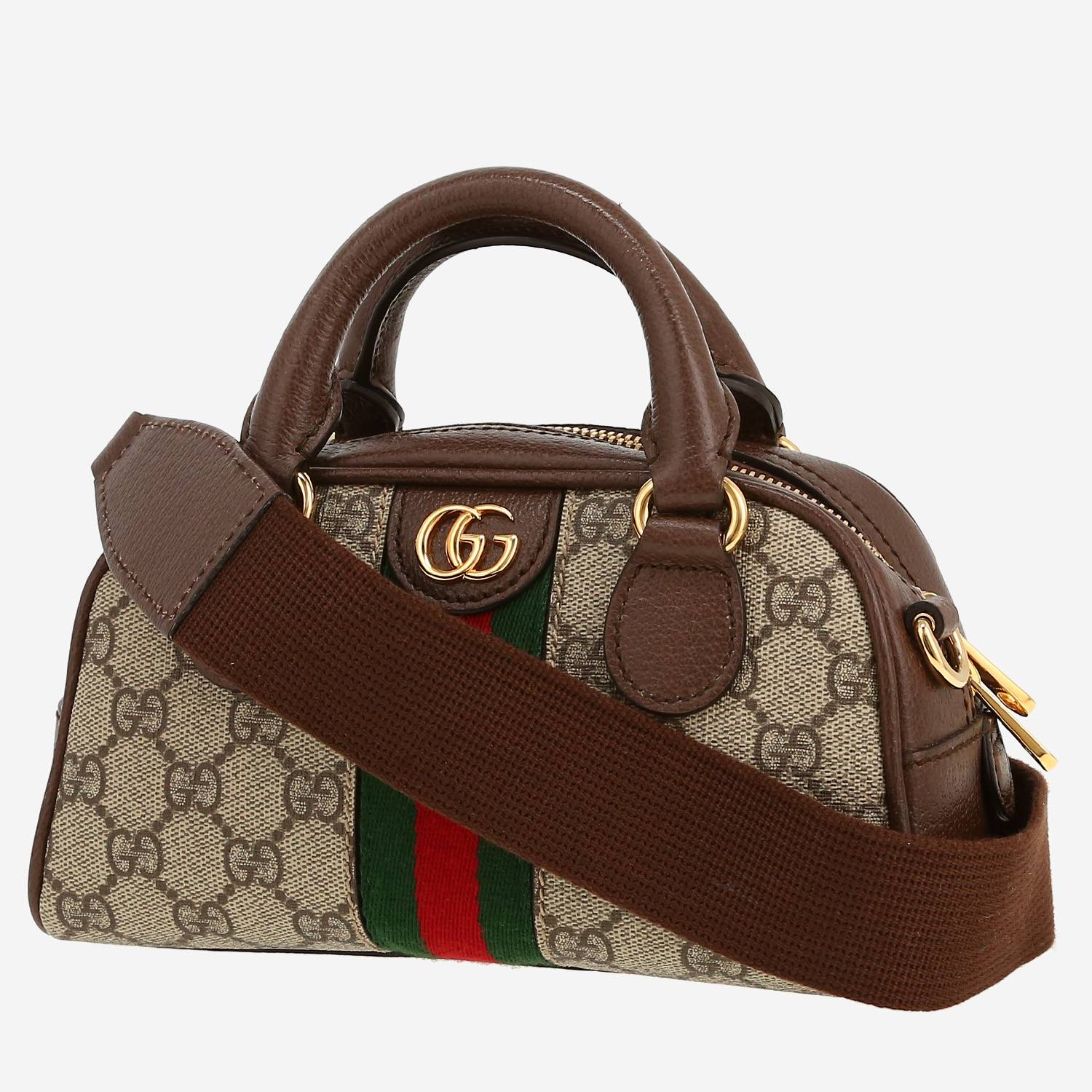 Surprising mini Gucci Ophidia shoulder bag in beige "sûpreme GG" canvas, hardware in gilt metal, double handle in brown leather, one removable shoulder strap in brown canvas allowing the bag to be worn in the hand or on the shoulder or accross the body.