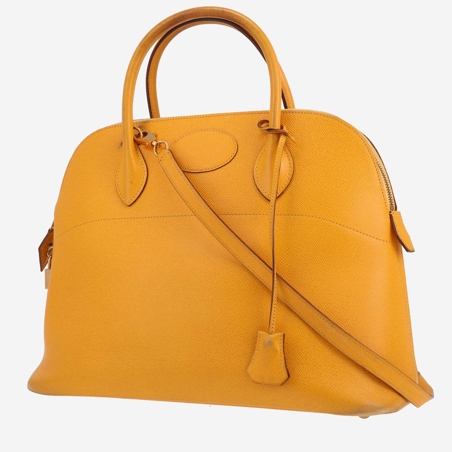 Unavoidable Hermès Bolide 35 cm handbag in yellow Courchevel leather, hardware in gilt metal, double handle in yellow leather, removable strap in yellow leather allowing the bag to be worn in the hand or on the shoulder.