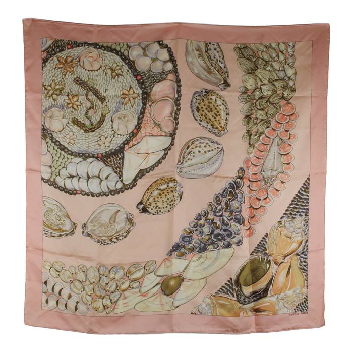 Charming carré scarf "Rocaille" in pink twill silk with a beautiful seashell theme.