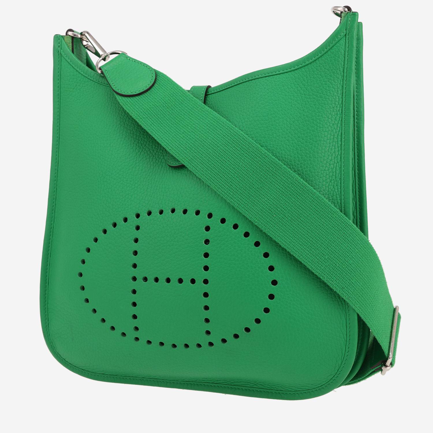 Wonderful Hermès Evelyne III shoulder bag in green Bamboo togo leather, hardware in palladium metal, green canvas adjustable and removable strap to be worn accross the body allowing the bag to be worn in the hand or on the shoulder or accross the body.