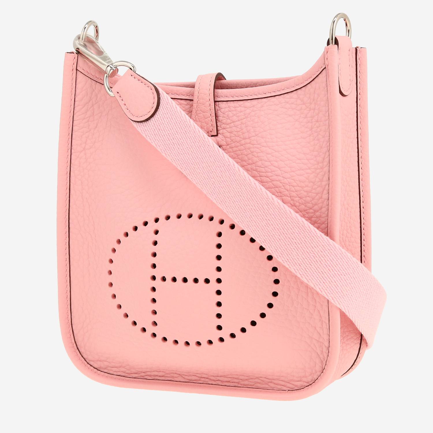 Wonderful Hermès Mini Evelyne shoulder bag in Rose Sakura leather taurillon clémence, hardware in palladium metal, Rose Sakura canvas removable strap to be worn accross the body allowing the bag to be worn on the shoulder or accross the body.