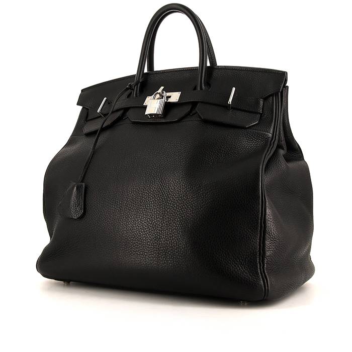 Elegant Hermes Haut à Courroies weekend bag in black togo leather, hardware in palladium metal, double handle in black leather allowing the bag to be worn in the hand.