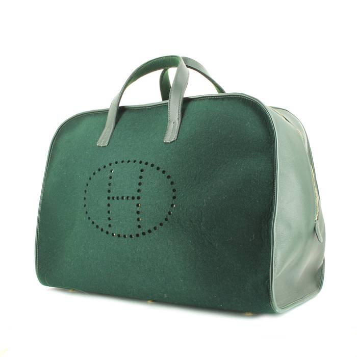 Beautiful travel bag in green whool and leather, zip fastener, double green leather handle allowing the bag to be carried in the hand.