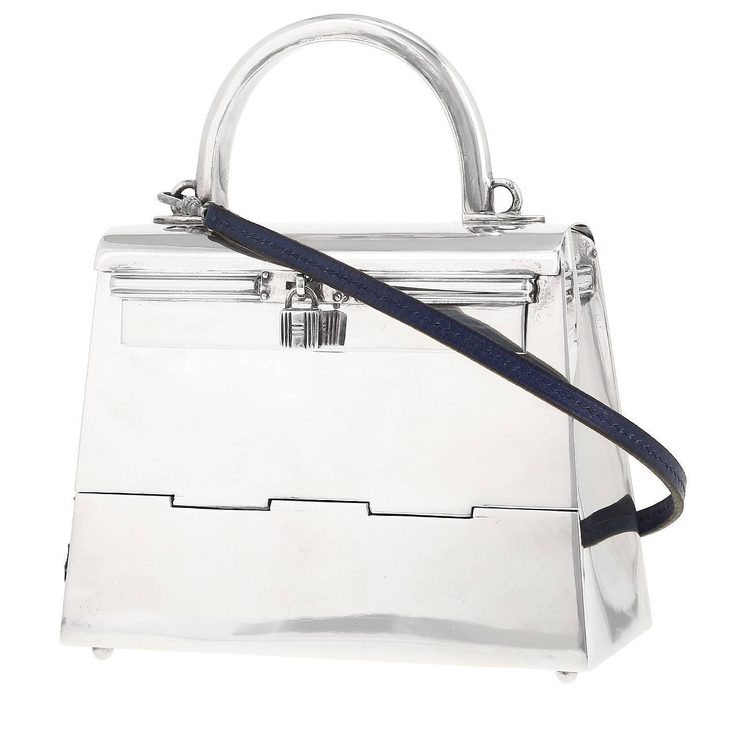 To celebrate the 90th anniversary of the Kelly by Hermès, Collector Square presents one of the most exclusive versions of its must-have bag. This 15cm Kelly in silver is a spectacular piece created in 1992. With this production, Hermès once again reveals the virtuosity of its know-how and renews the codes of its iconic bag. In this version, the goldsmithing embraces the codes of the leather goods. This collector"s item is produced in a very limited edition of around one hundred pieces. The bag is sold with its original shoulder strap in navy blue box leather.