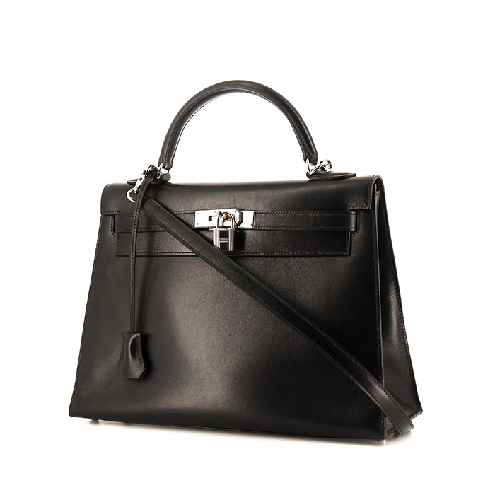 Elegant Hermes Kelly 32 cm handbag in black box, hardware in palladium metal, saddle stitching, simple handle in black box, black leather removable strap to be worn accross the body allowing the bag to be worn in the hand or on the shoulder.