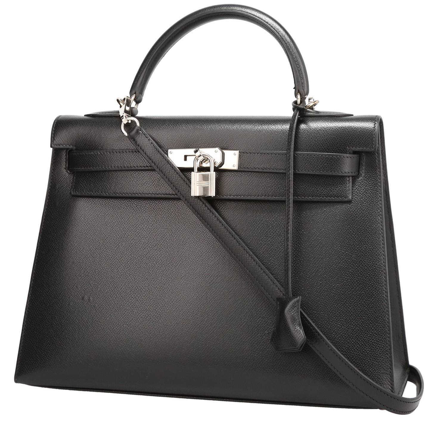 Rare Hermès Kelly 32 cm handbag in black epsom leather, hardware in palladium metal, simple handle in black leather, black leather removable strap to be worn accross the body allowing the bag to be worn in the hand or on the shoulder.