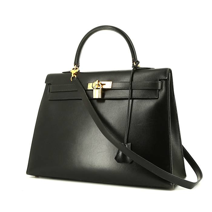 Elegant Hermès Kelly 35 cm handbag in black box leather, hardware in gilt metal, top handle in black leather, black leather removable strap to be worn accross the body allowing the bag to be worn in the hand or on the shoulder.
