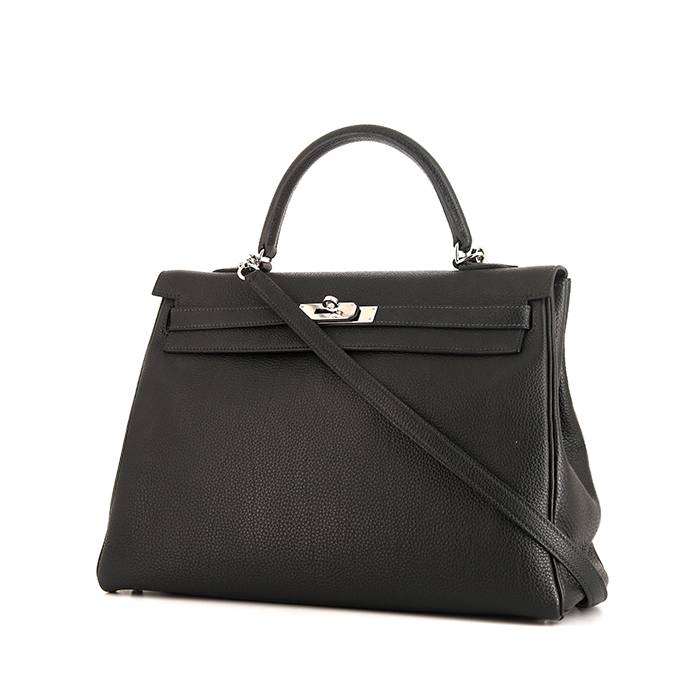 Nice and original Hermes Kelly 35 cm handbag in black togo leather, hardware in palladium metal, top handle in black leather, black leather removable strap to be worn accross the body allowing the bag to be worn in the hand or on the shoulder.