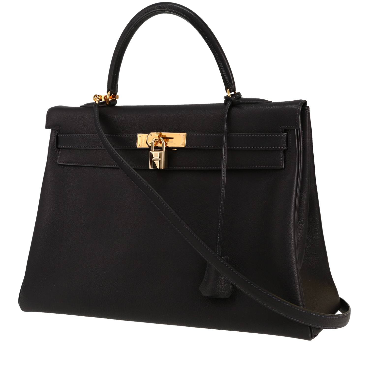 Famous Hermès Kelly 35 cm handbag in navy blue grained leather, hardware in gilt metal, simple handle in navy blue grained leather, navy blue grained leather removable strap to be worn accross the body allowing the bag to be worn in the hand or on the shoulder or accross the body.
