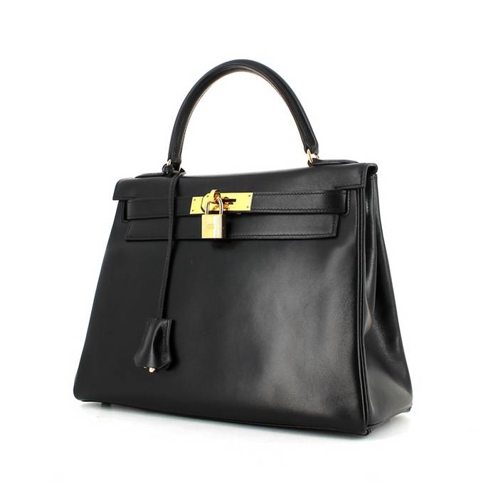 Nice "Kelly 28 cm" handbag in black box leather, hardware in gilt metal , black leather simple handle.