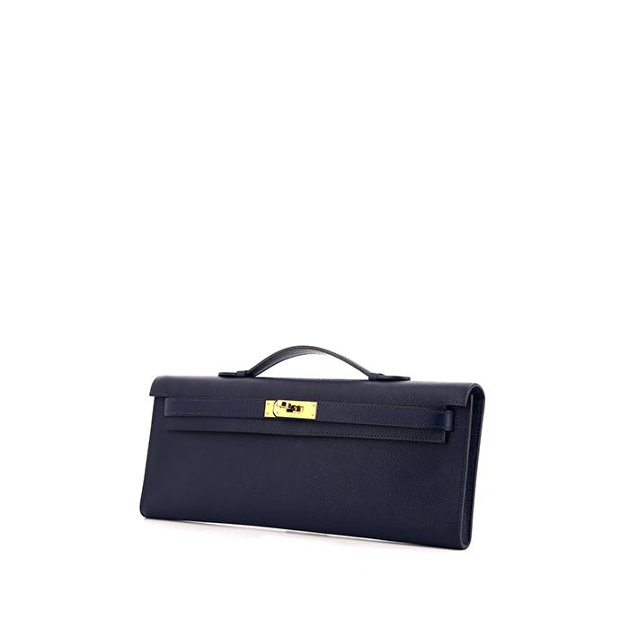 Chic Hermès Kelly Cut pouch in blue epsom leather, hardware in gilt metal, top handle in blue epsom leather allowing the clutch to be worn in the hand.