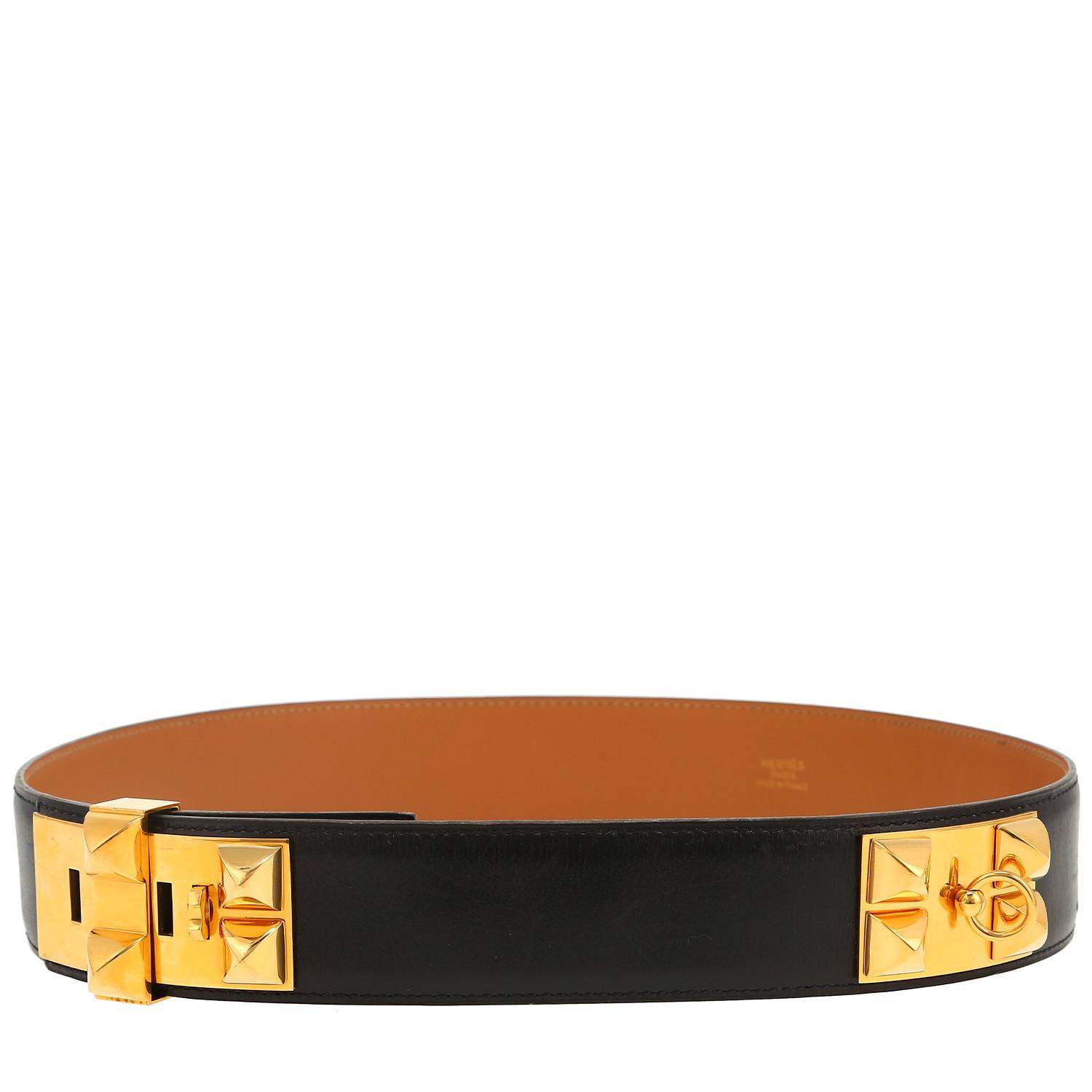 Timeless Hermès Médor belt in black box leather, hardware in gilt metal worn on the waist.