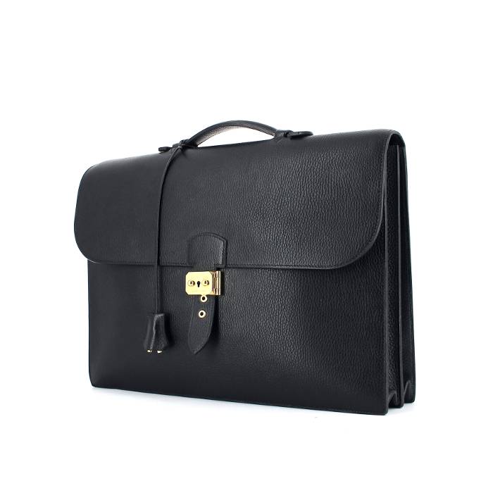 Beautiful "Sac à Dépêches" in black Fjord leather, gold-plated hardware, sliding catch fastener, handle.