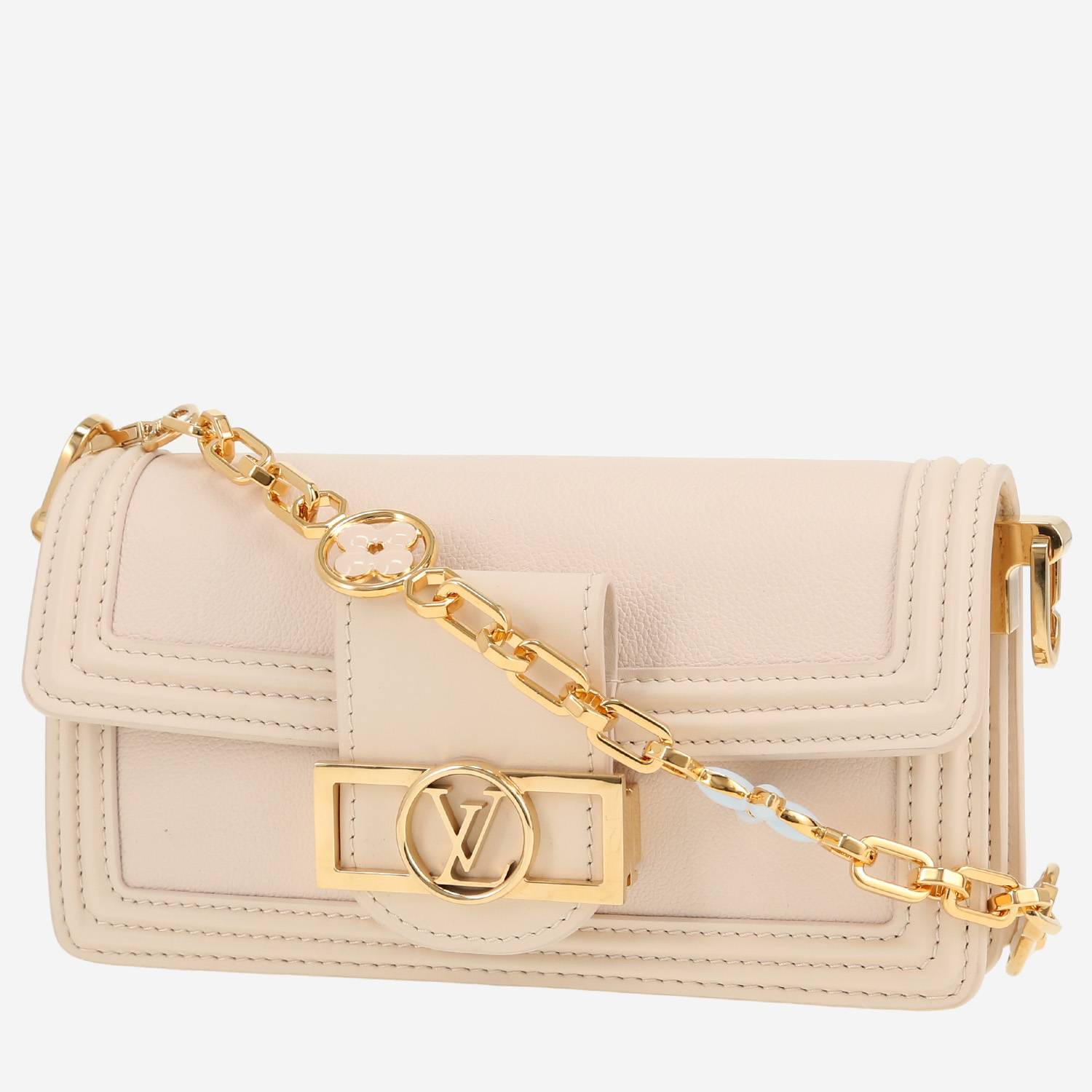 Wonderful Louis Vuitton Dauphine East West shoulder bag in powder pink leather, hardware in gilt metal, one chain strap in gilt metal, powder pink leather adjustable strap to be worn accross the body allowing the bag to be worn in the hand or on the shoulder or accross the body.