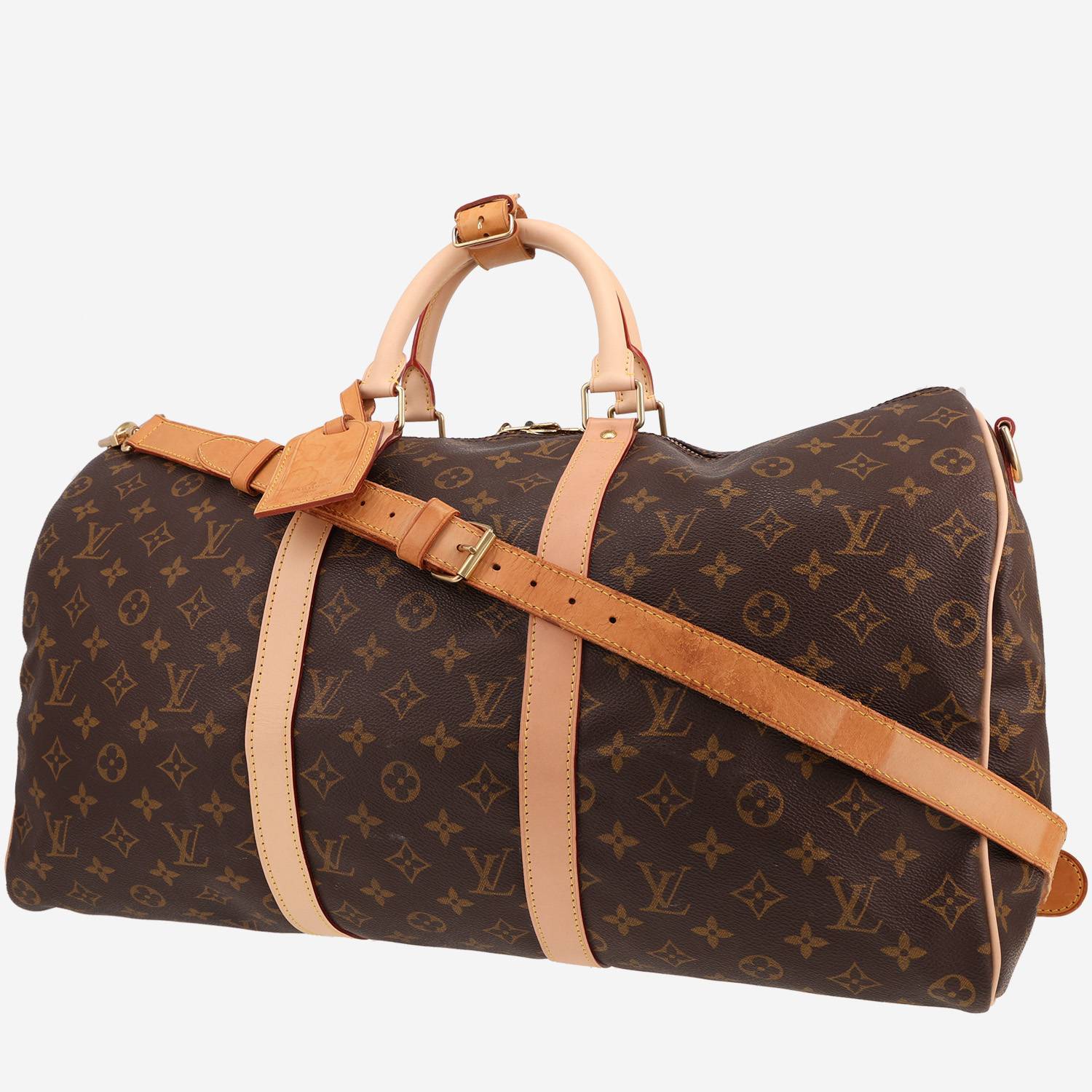 Timeless Louis Vuitton Keepall 50 travel bag in brown monogram canvas, hardware in gilt metal, double handle natural leather, natural leather strap to be worn accross the body allowing the bag to be worn in the hand or on the shoulder or accross the body.